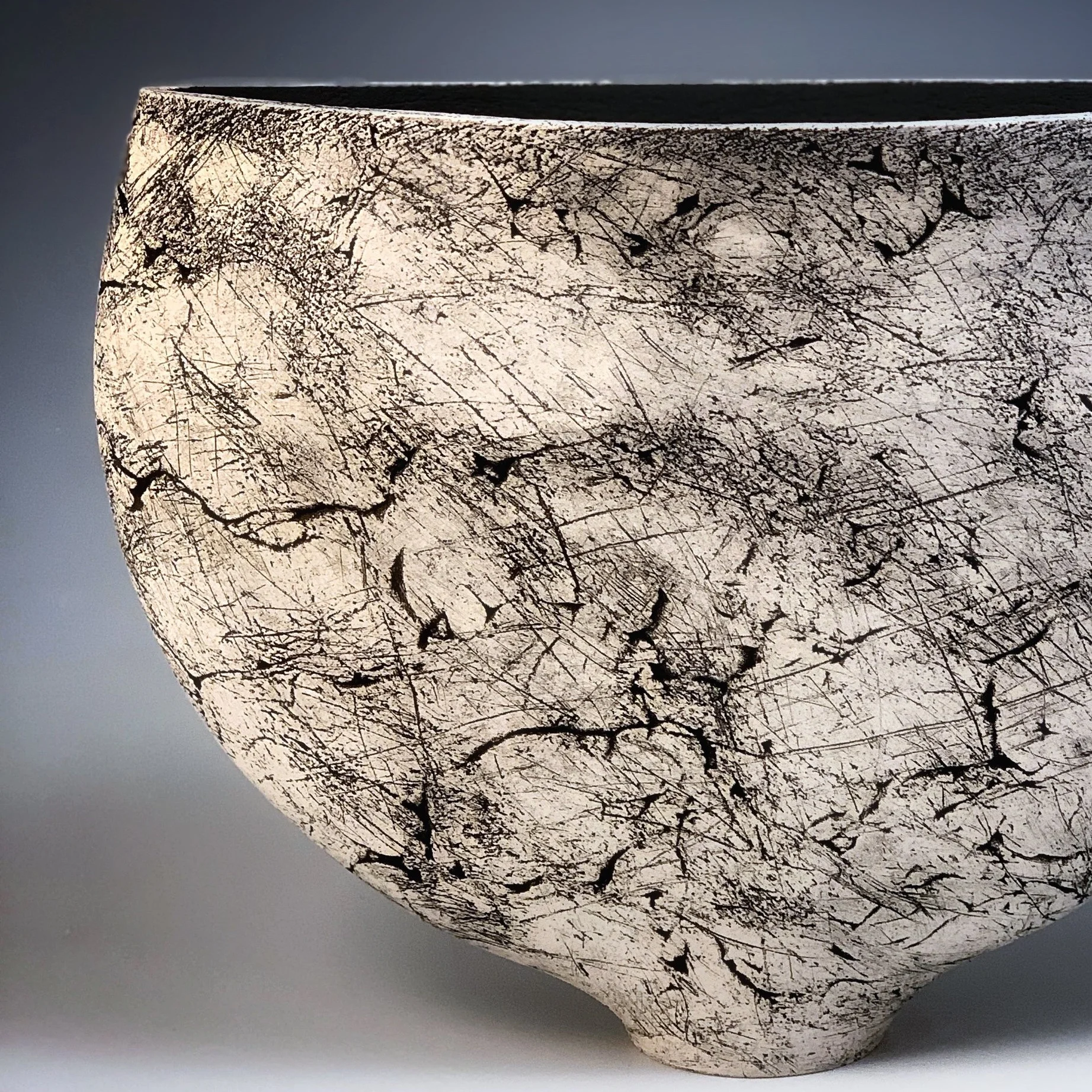 This striking hand-built ceramic vessel demonstrates a harmonious blend of form, texture, and color. The carved surface features intricate detailing achieved through the multiple applications of underglaze stains, chalks, and pencils.